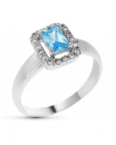 Elegante sortija de oro blanco de 18 quilates con una llamativa piedra de color azul de corte rectangular enmarcada por una delicada orla de circonitas. Con medidas de 9,5 x 8 mm y peso aproximado 2,9 gramos, presenta un diseño sofisticado de sortija fuerte ideal para ocasiones especiales. Incluye marca de contraste oficial 750 que certifica el oro de 18 kilates, estuche de Joyería Falomir y envío gratuito a península en 3-4 días laborables. Joyería Falomir, en Llíria (Valencia) desde 1799.