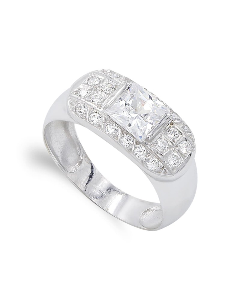 Sortija de oro blanco de 18 quilates con diseño robusto de 9 mm de ancho, con peso aproximado de 4,4 gramos. Presenta una piedra central rectangular engastada y múltiples circonitas que la rodean creando un conjunto brillante y sofisticado.