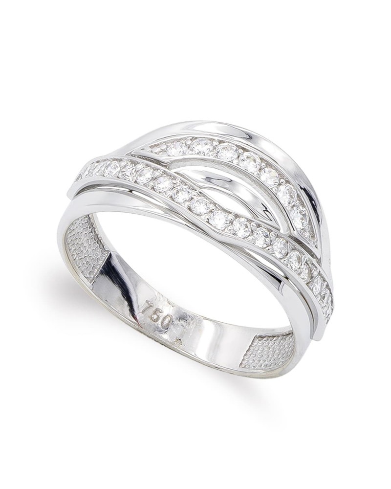 Esta sortija de oro blanco presenta un diseño contemporáneo con líneas entrecruzadas que crean un efecto calado muy atractivo. Las circonitas se distribuyen por toda la superficie formando ondas brillantes que capturan la luz desde múltiples ángulos, creando un juego de destellos elegante y sofisticado.