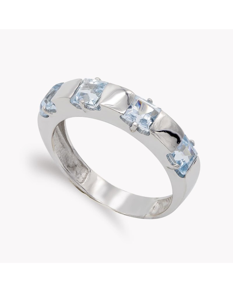 Confeccionada en oro blanco de 18 quilates con un ancho de 4 mm, ofrece peso aproximado 4,0 gramos que proporciona una sensación sólida y confortable en el dedo. Las piedras de color aguamarina están perfectamente engastadas, creando un conjunto armonioso y brillante.
