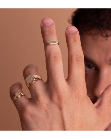 Sortija sello de oro amarillo de 18 quilates con elegante cabeza oval alargada perfecta para grabado personalizado. La zona de grabado mide 12x3,5 mm y tiene un peso aproximado de 1,9 gramos, ofreciendo el equilibrio perfecto entre elegancia y discreción.