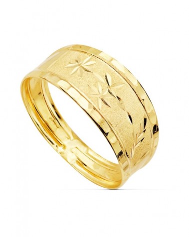 Elegante sortija de oro amarillo de 18 quilates con diseño de flores talladas y acabado matizado que combina superficies pulidas con texturizadas. Presenta un ancho de 9mm y peso aproximado 1,1 gramos, ofreciendo un equilibrio perfecto entre elegancia y comodidad.