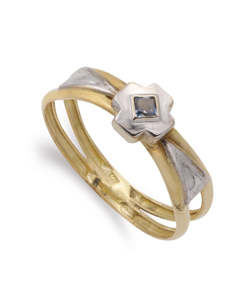 Sortija de oro bicolor de 18 quilates con diseño de doble aro y motivo central de cruz engastada con circonita. Ancho de 6,5 mm y peso aproximado 1,3 gramos, combina oro amarillo y blanco en un diseño moderno y elegante.