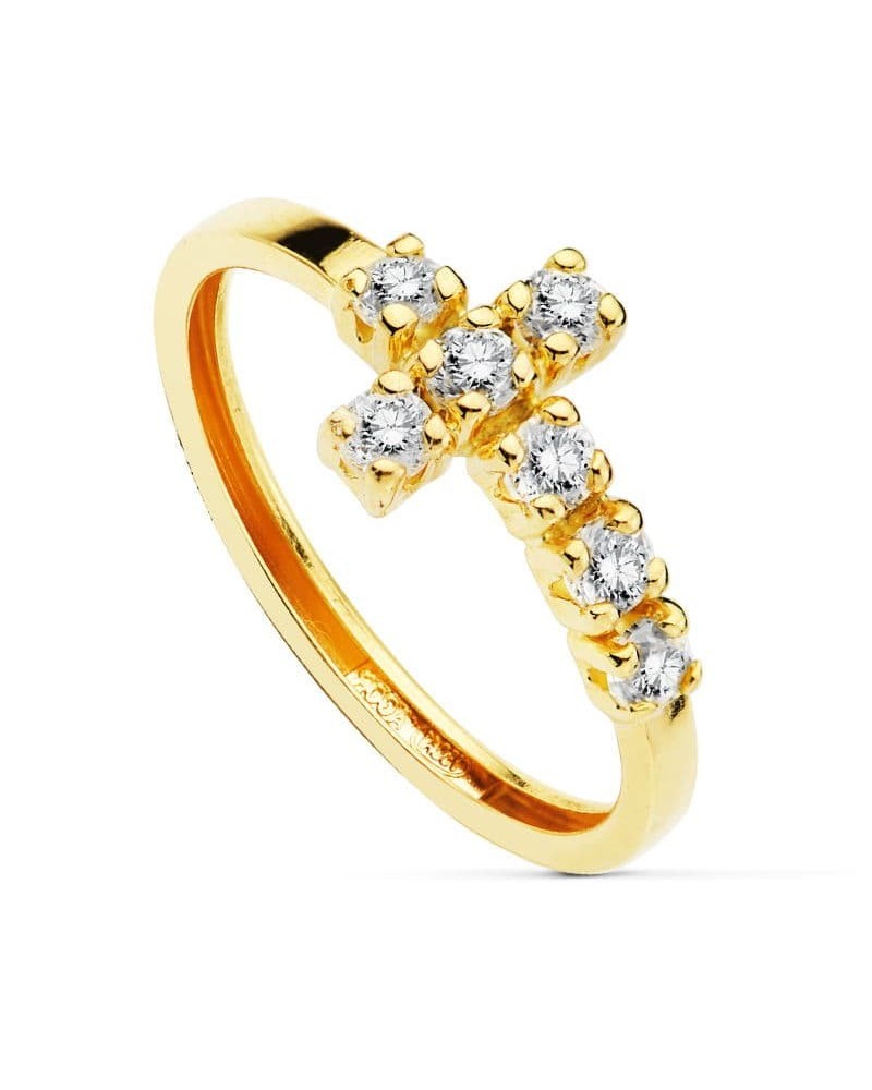 Fabricado en oro amarillo de 18 kilates con acabado pulido brillante, el anillo tiene un ancho de 8 mm que proporciona presencia sin resultar excesivo. Con un peso aproximado de 1,1 gramos, es una pieza cómoda para el uso diario. Las siete circonitas están perfectamente engastadas formando la cruz, aportando luminosidad y distinción al conjunto.