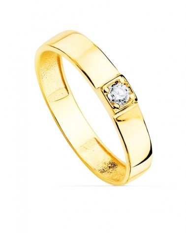 Esta sortija de oro amarillo destaca por su diseño elegante y atemporal, con una circonita central perfectamente engastada en una montura cuadrada que le aporta un toque moderno. El oro amarillo de 18 kilates presenta un acabado brillante que refleja la luz de manera exquisita, creando destellos dorados que realzan la belleza de la circonita.