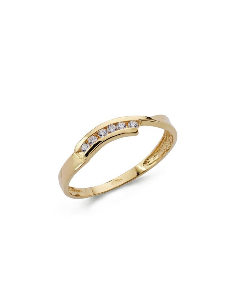 Esta sortija de oro amarillo de 18 quilates destaca por su diseño contemporáneo y elegante. La pieza presenta una banda pulida con un detalle central donde se alojan las circonitas engastadas en una línea, creando un efecto luminoso y sofisticado que realza la calidez del oro amarillo.