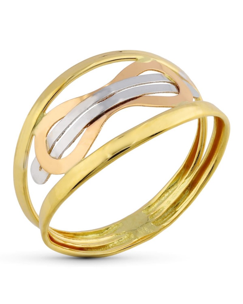 Sortija de oro de 18 kilates tricolor con elegante diseño que evoca el símbolo del infinito. La pieza combina oro amarillo, oro blanco y oro rosa en una composición moderna y sofisticada, con peso aproximado 1,1 gramos.