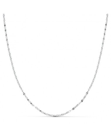 Cadena de oro blanco de 18 kilates con un largo de 45cm. Es una cadena con un efecto "diamante", eso quiere decir que el oro está tallado de tal manera que aumenta los reflejos con la luz para darle más brillo. Tiene un ancho de 1,5 mm. Incluye una marca de contraste oficial 750 y sello de fabricante. Se entrega con estuche y toda la garantía de la joyería más antigua de España.