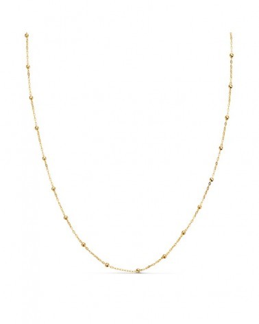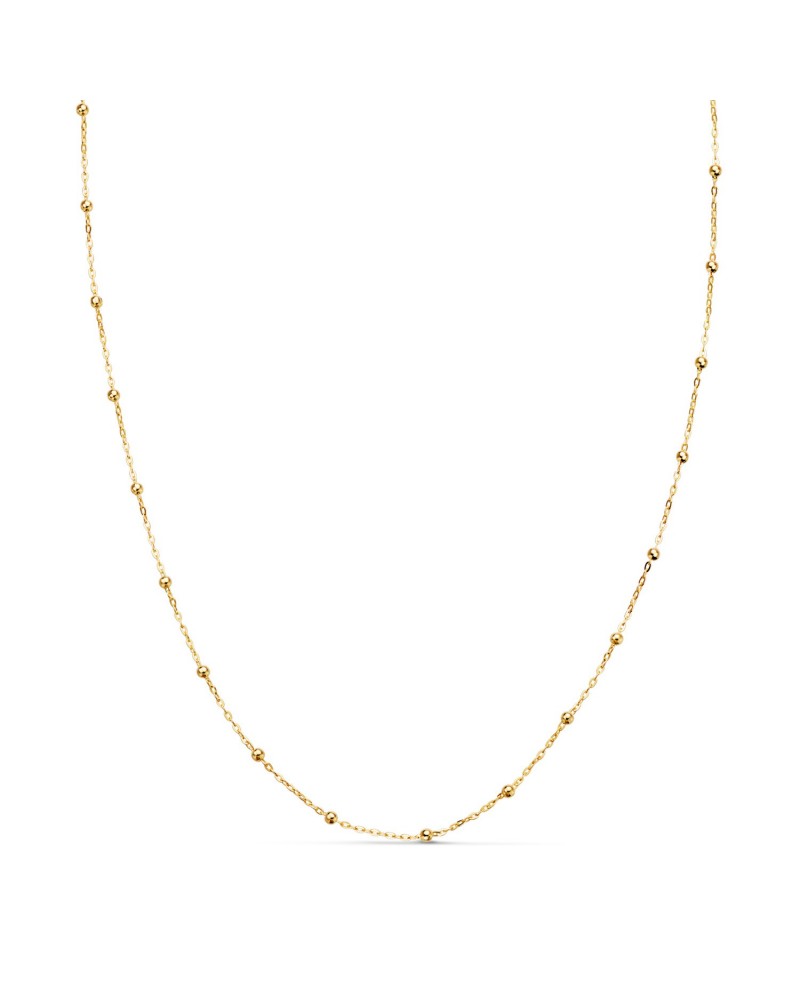 Elegante cadena de oro amarillo de 18 kilates con eslabones tipo forzado decorados con pequeñas bolas de 2mm a intervalos regulares. Con una longitud de 45cm y peso aproximado 1,6 gramos, es perfecta para lucir sola o como base para un colgante.