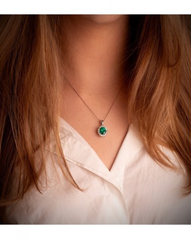 Este magnífico colgante presenta un diseño tipo roseta que destaca por su elegancia atemporal. La pieza central está protagonizada por una espectacular esmeralda recristalizada de intenso color verde que capta la luz de forma excepcional, creando destellos que van del verde esmeralda al verde más profundo. Alrededor de esta gema central se dispone una corona de diamantes de laboratorio que aportan un brillo incomparable, creando un contraste perfecto entre el verde vibrante y el blanco puro.