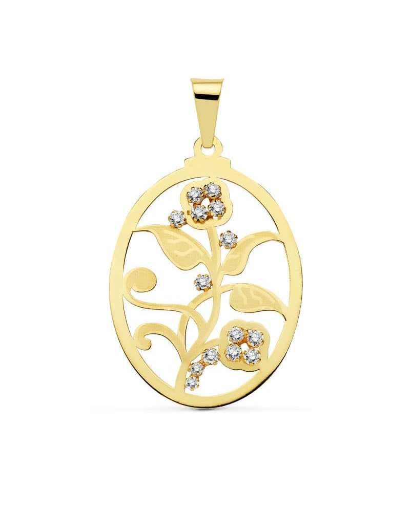 Este precioso colgante de oro amarillo presenta un diseño oval calado muy sofisticado, donde destaca una flor central con pétalos y hojas trabajados con delicadeza artesanal. Las circonitas brillantes se distribuyen estratégicamente por toda la composición floral, creando destellos de luz que realzan la belleza del conjunto y aportan un toque de elegancia refinada.