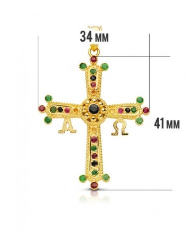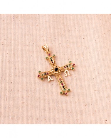 Esta magnífica Cruz de Covadonga presenta un diseño tradicional elaborado en oro amarillo de 18 quilates con acabado completamente pulido. La pieza destaca por sus elegantes proporciones y los detalles decorativos que adornan toda su superficie, incluyendo las características letras griegas Alfa y Omega que cuelgan de los brazos laterales, símbolos del principio y el fin en la tradición cristiana.