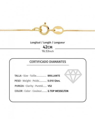 Collar de oro de 18 kilates con un diamante con una talla brillante total de 0,010kilatesy un tamaño de 45cm. Las cruces forman parte de la colección de oro de Falomir Joyas, y se entregan con estuche y marca de contraste oficial.