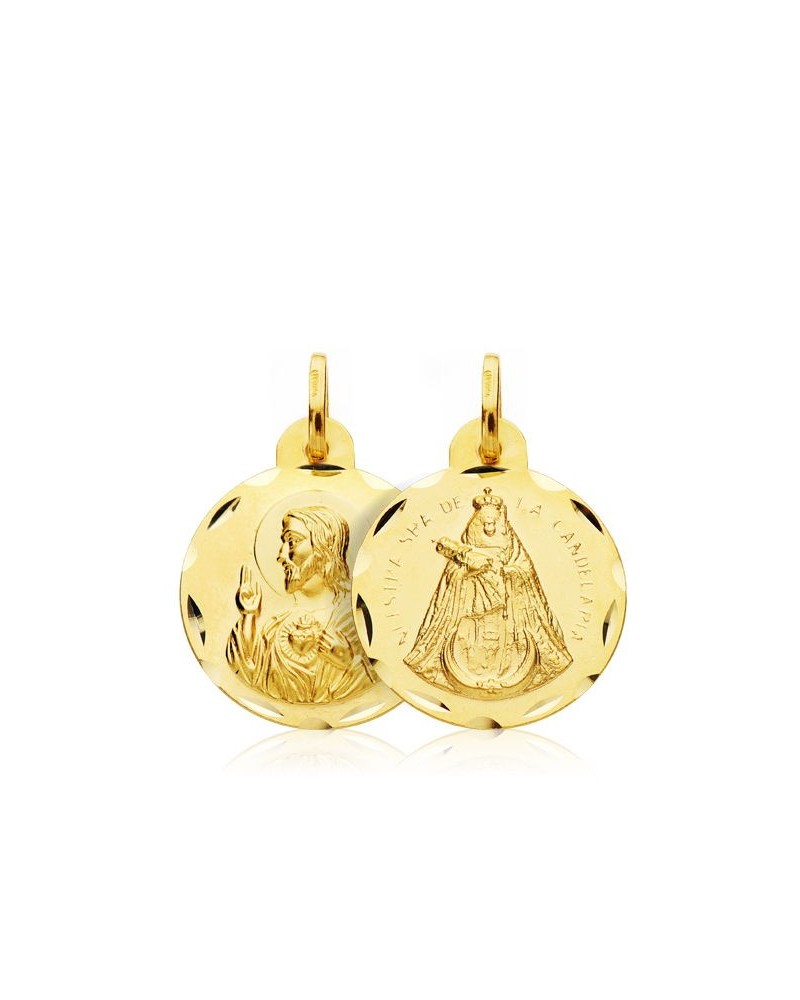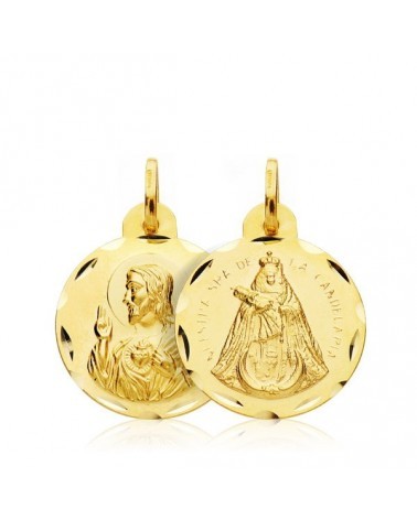 Este elegante escapulario religioso presenta un diseño circular clásico con acabado en oro amarillo brillante. En una de sus caras se aprecia la imagen del Sagrado Corazón de Jesús finamente grabada, mientras que en el reverso luce la figura de la Virgen de la Candelaria, patrona de las Islas Canarias, con la inscripción que la identifica.
