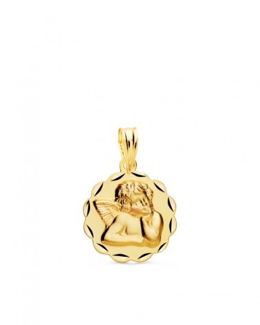 Medalla de oro de 18 kilates con un ángel Burlón y un tamaño de 14mm. Esta medalla forma parte de la colección de oro de Falomir Joyas, y se entrega con estuche y marca de contraste oficial.