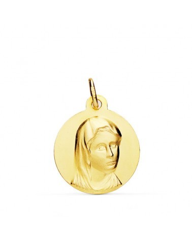 Esta medalla de oro amarillo de 18 quilates presenta la imagen de la Virgen María en el característico estilo francés, con un diseño circular de proporciones perfectas. El rostro mariano se representa con delicadeza y serenidad, enmarcado por el tradicional velo que fluye con naturalidad. El acabado pulido brillante del oro amarillo aporta luminosidad y resalta cada detalle de la talla, creando una pieza de gran belleza devocional.