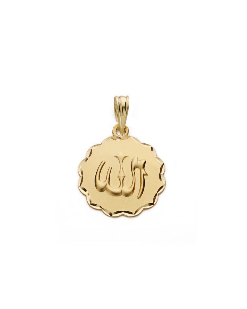 Medalla de oro de 18 kilates con una frase árabe y un tamaño de 16mm. Esta medalla forma parte de la colección de oro de Falomir Joyas, y se entrega con estuche y marca de contraste oficial.