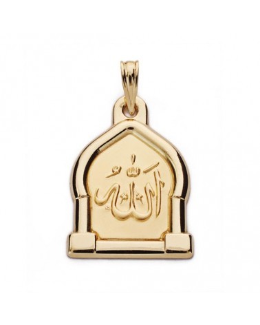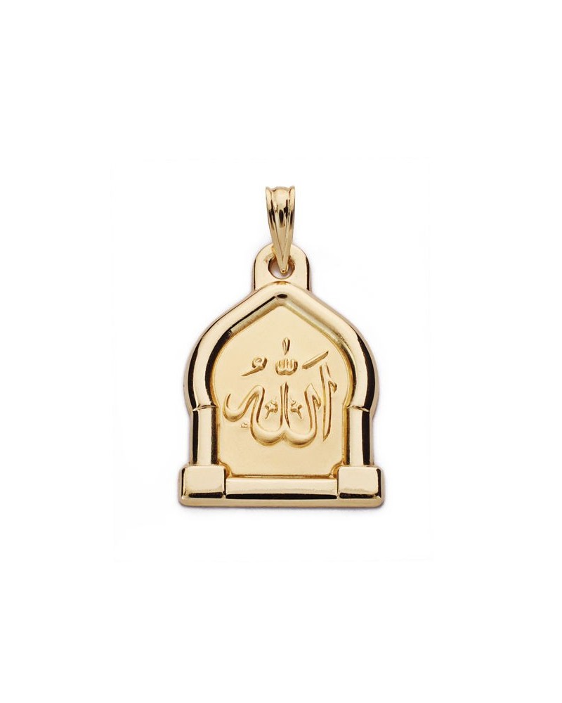 Medalla de oro amarillo de 18 quilates con inscripción árabe y elegante diseño en forma de arco arquitectónico. Presenta medidas de 24x24 mm y peso aproximado 2,5 gramos, perfecta para quienes buscan una pieza con significado espiritual y cultural.