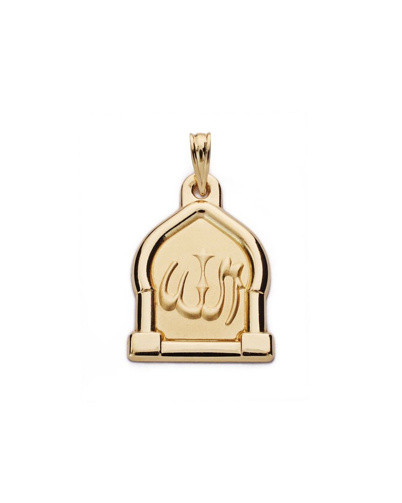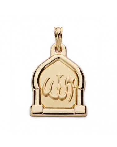 Esta elegante medalla árabe presenta un diseño tradicional con forma de arco que enmarca la sagrada inscripción de Alá en caligrafía árabe. Su acabado pulido en oro amarillo resalta la belleza de los trazos caligráficos, creando una pieza de gran valor espiritual y estético que simboliza la devoción religiosa musulmana.