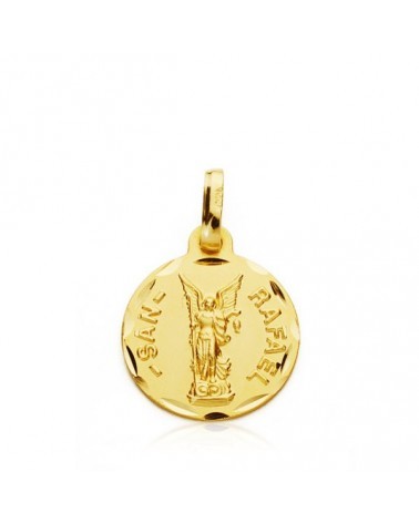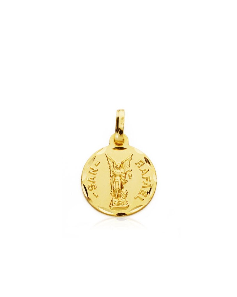 Esta medalla de San Rafael presenta un diseño clásico y elegante en oro amarillo de 18 quilates. La pieza circular muestra la figura del arcángel San Rafael grabada en relieve en el centro, con gran detalle y definición. El borde está decorado con la inscripción "SAN RAFAEL" que enmarca perfectamente la imagen sagrada, creando una composición equilibrada y tradicional.