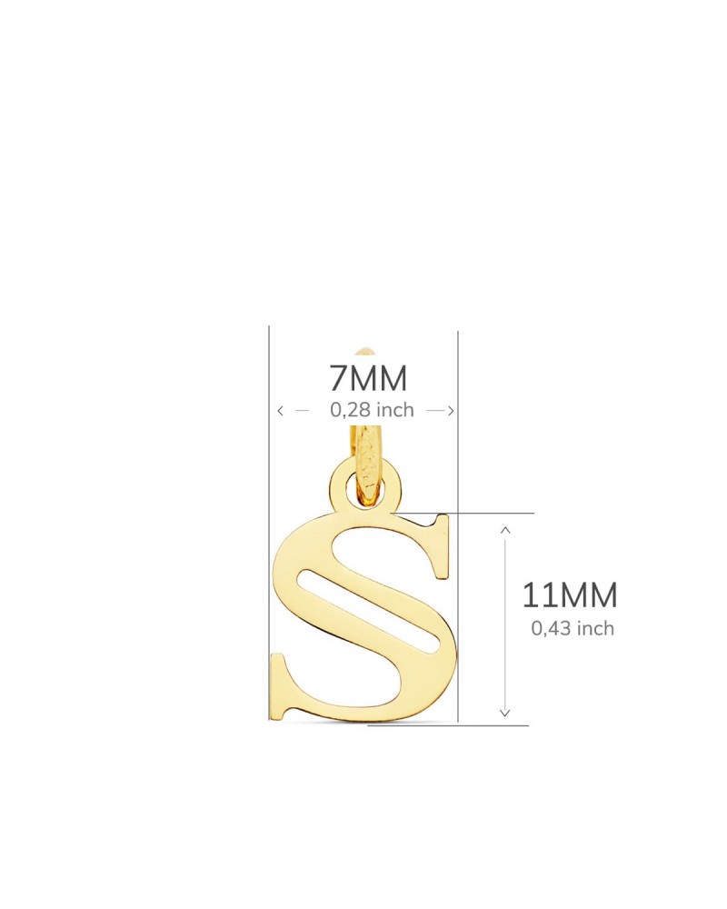 Inicial de oro amarillo de 18 kilates, letra S, con un tamaño de 11 x 7mm. El colgante forma parte de la colección de oro de Falomir Joyas, y se entrega con estuche y marca de contraste oficial.