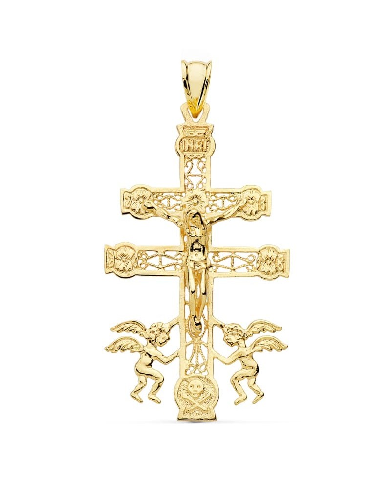 Cruz de oro de 9k con un tamaño de 49x27mm. . Las cruces forman parte de la colección de oro de Falomir Joyas, y se entregan con estuche y marca de contraste oficial.