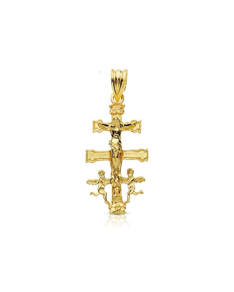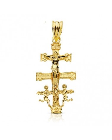 Cruz de Caravaca en oro amarillo de 9 quilates con figura de Cristo finamente labrada. Presenta medidas de 28 x 14 mm y peso aproximado 1,5 gramos, perfecta para llevar como símbolo de protección y fe.