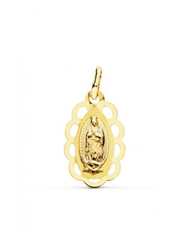 Medalla de Oro de 18k Virgen de Guadalupe con un tamaño de 19 x 12 mm. Esta medalla forma parte de la colección de oro de Falomir Joyas, y se entrega con estuche y marca de contraste oficial.
