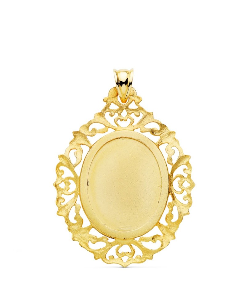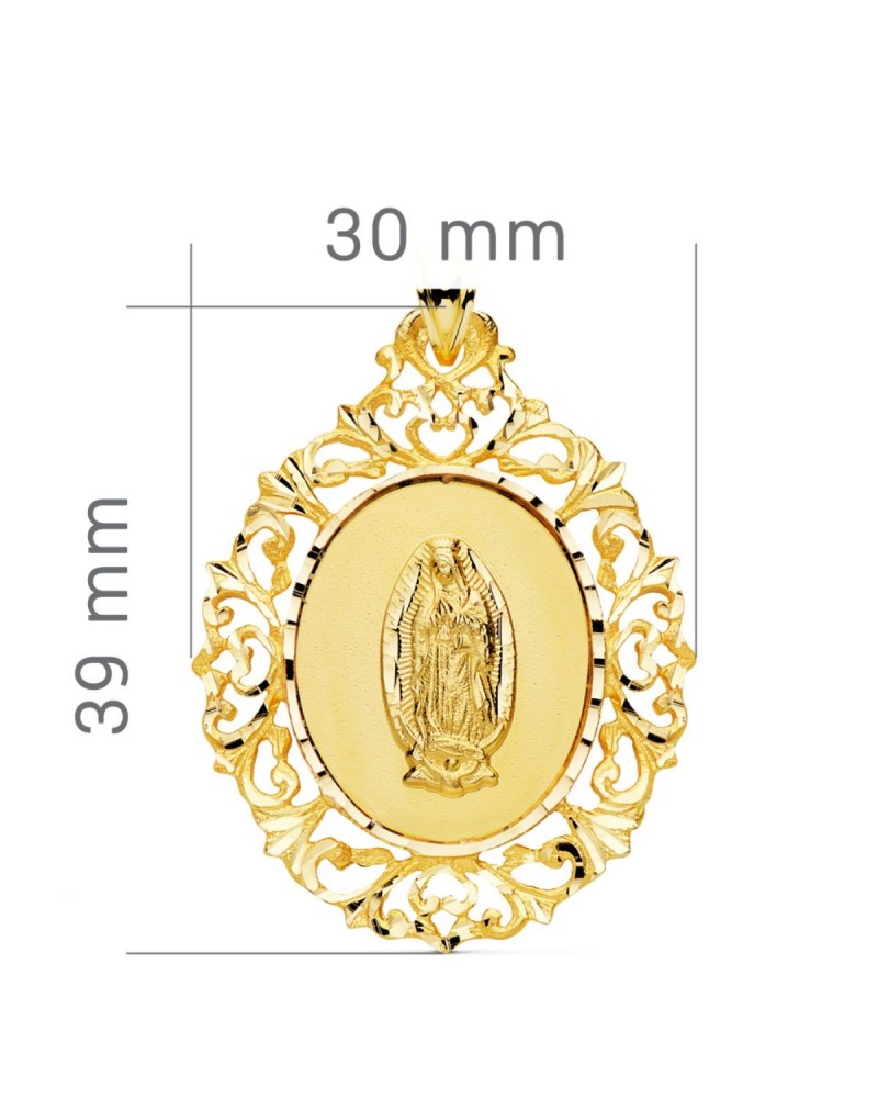Medalla de Oro de 18k Virgen de Guadalupe con un tamaño de 39 x 30 mm. Esta medalla forma parte de la colección de oro de Falomir Joyas, y se entrega con estuche y marca de contraste oficial.