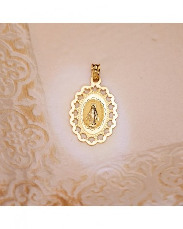 Medalla de Oro de 18k Virgen de la Milagrosa con un tamaño de 34 x 22 mm. Esta medalla forma parte de la colección de oro de Falomir Joyas, y se entrega con estuche y marca de contraste oficial.