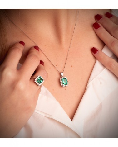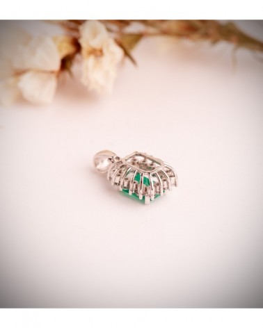 Elaborado en oro blanco de 18 quilates, este colgante presenta unas medidas de 8x6 mm y un peso aproximado de 2,8 gramos. Los diamantes de laboratorio que rodean la esmeralda central ofrecen una calidad excepcional VS2-G, garantizando un brillo y pureza extraordinarios. El engaste tipo garra asegura la perfecta sujeción de cada piedra, mientras que la anilla superior permite su uso con cualquier cadena.