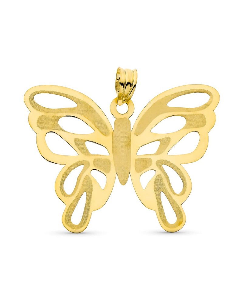 Precioso colgante de mariposa en oro amarillo de 18 quilates con diseño calado que resalta la belleza y delicadeza de este símbolo de transformación. Medidas 39x30mm y peso aproximado 3,2 gramos, con acabado láser que aporta textura y brillo excepcional.