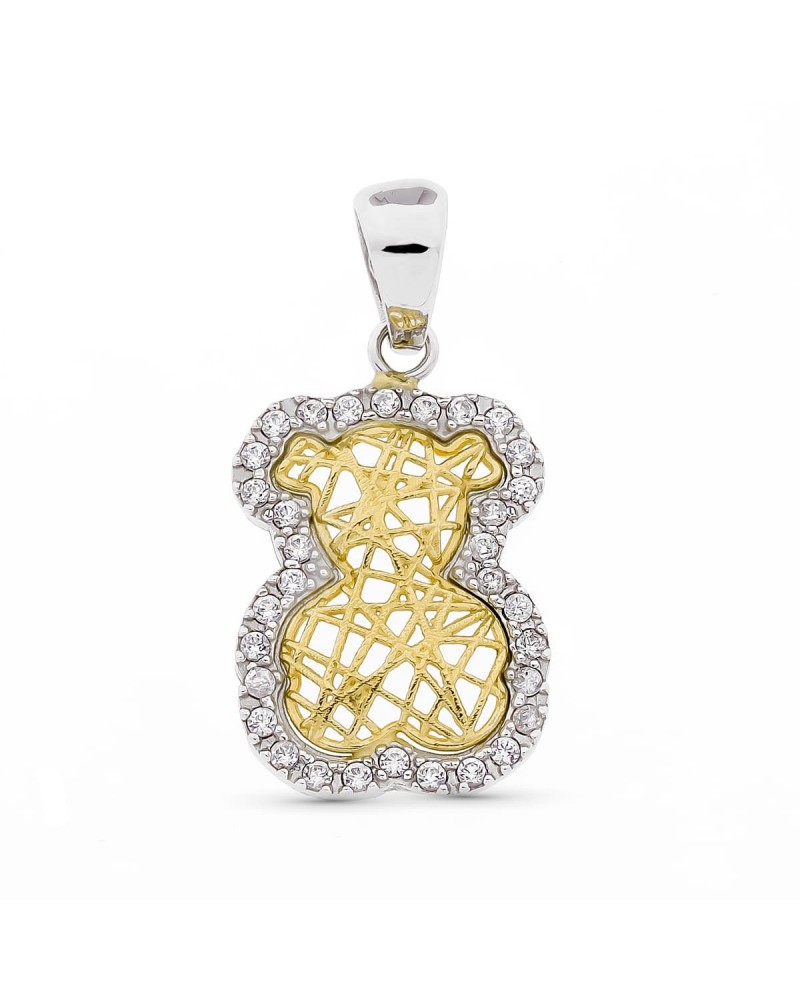 Colgante de oro de 18 quilates en acabado bicolor con diseño de amuleto en forma de oso. Presenta circonitas engastadas que rodean la figura y peso aproximado 4,0 gramos.