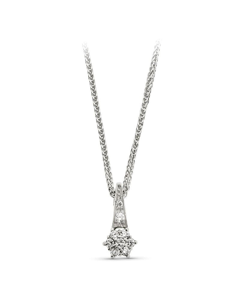 Elaborado en oro blanco de 18 kilates, este colgante combina la pureza del metal noble con el brillo de las circonitas engastadas. Su peso aproximado de 4,2 gramos le proporciona una presencia sutil pero distinguida. El acabado pulido realza tanto el oro blanco como las piedras, creando contrastes de luz que realzan su belleza.