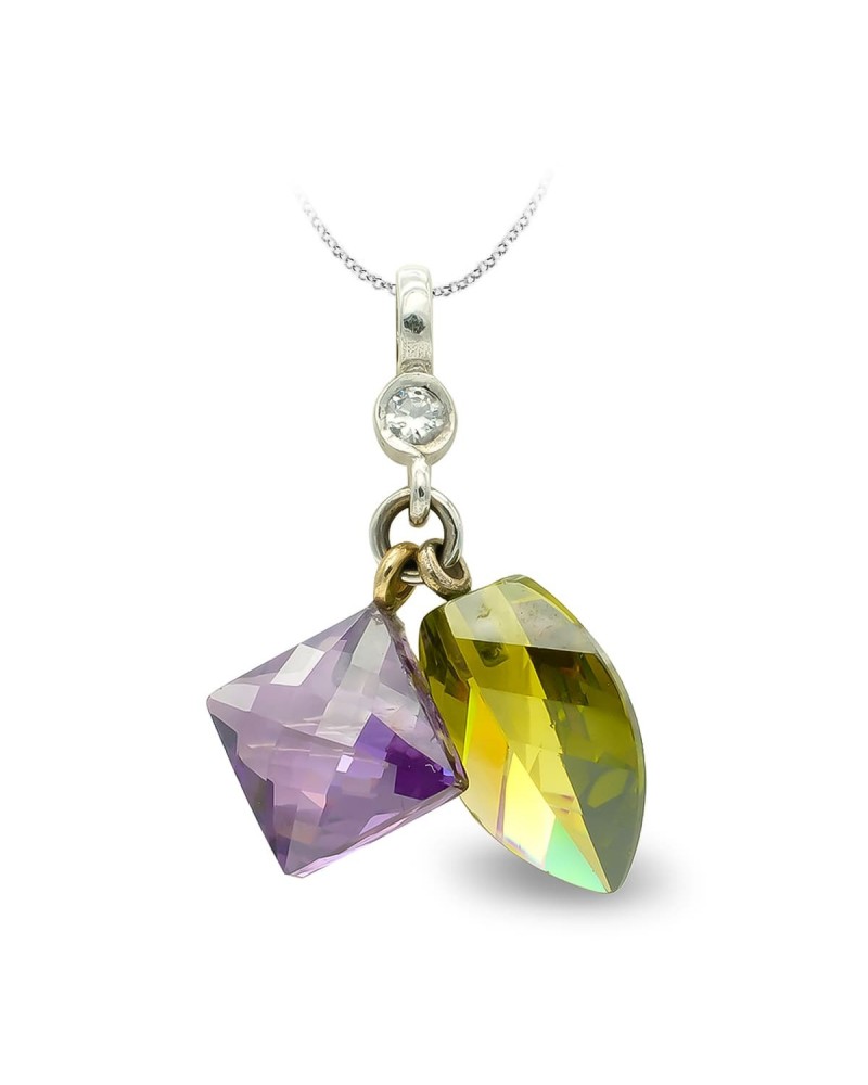 Elaborado en oro blanco de 18 quilates, este colgante destaca por su acabado pulido que realza la pureza del metal. El peso aproximado de 3,4 gramos le confiere la consistencia perfecta, ofreciendo presencia sin resultar pesado al llevarlo. La combinación cromática entre el violeta intenso de la amatista y los tonos verdes del topacio crea un contraste armonioso y distintivo.