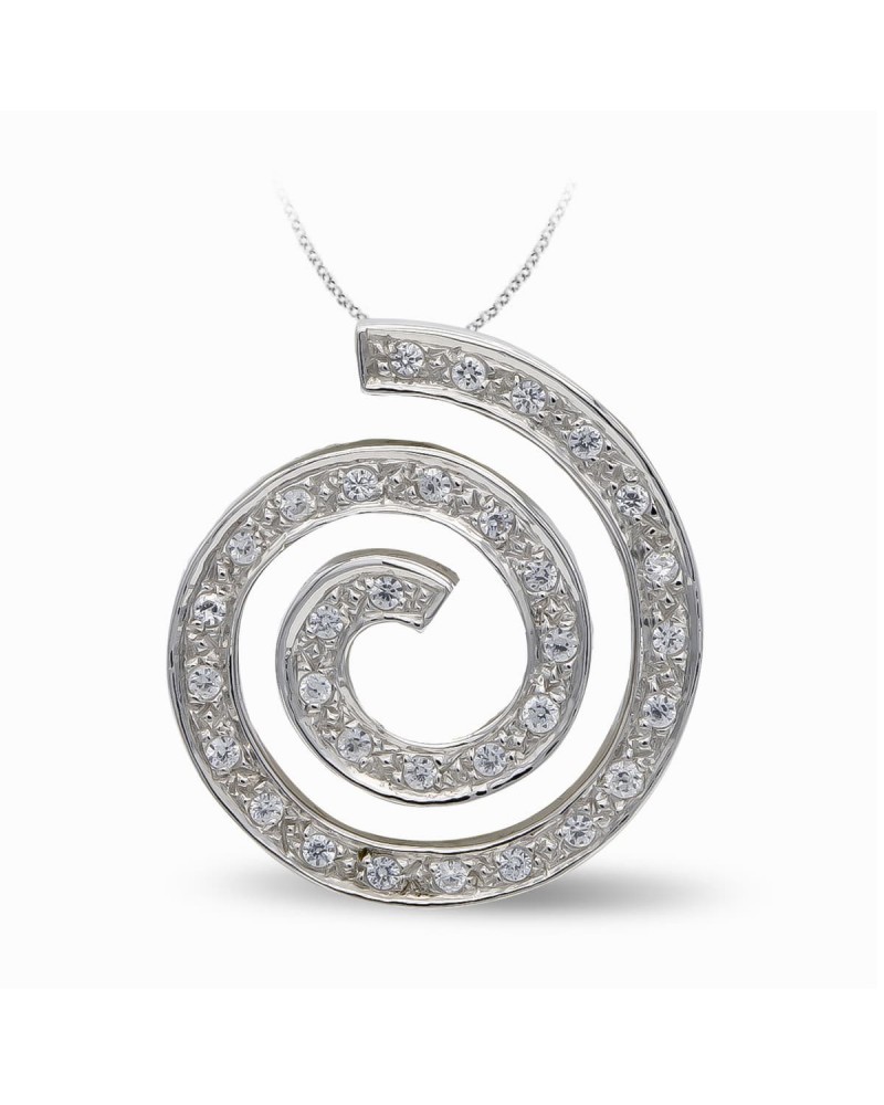 Colgante de oro blanco de 18 quilates con diseño en espiral engastado con circonitas que aportan luminosidad y elegancia. Su forma dinámica y acabado brillante lo convierten en una pieza sofisticada y atemporal, con un peso aproximado 3,9 gramos.