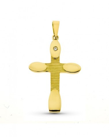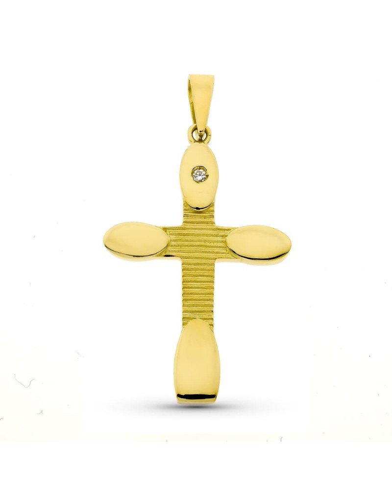 Esta elegante cruz de oro amarillo presenta un diseño contemporáneo sin Cristo que combina diferentes acabados para crear un efecto visual muy atractivo. La pieza destaca por el contraste entre las zonas pulidas de los extremos y el acabado rayado del centro, mientras que una circonita engastada en la parte superior añade un toque de distinción y luminosidad.