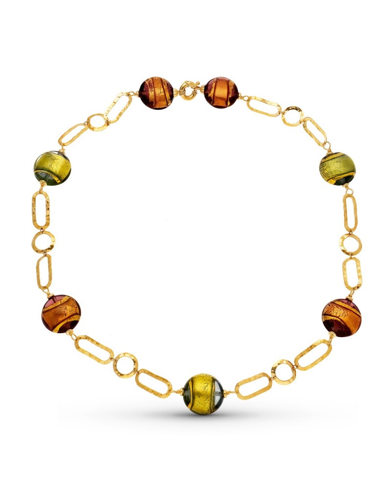 Esta gargantilla de oro amarillo de 18 kilates destaca por su diseño contemporáneo que alterna eslabones geométricos con bolas de cristal de Murano artesanal. Las bolas presentan tonalidades ámbar y verde con efectos metalizados que capturan la luz de manera espectacular, creando un juego cromático único que complementa perfectamente el brillo cálido del oro amarillo.