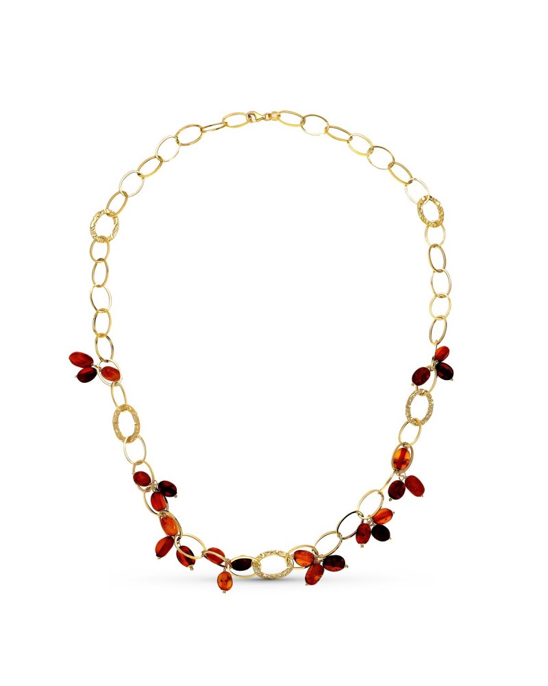 Esta sofisticada gargantilla presenta un diseño contemporáneo con eslabones ovalados de oro amarillo intercalados con delicadas piedras de color en tonalidades rojas y naranjas. Los eslabones lisos alternan con otros de acabado texturizado, creando un juego visual muy atractivo que enmarca el escote con elegancia y modernidad.