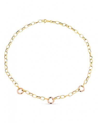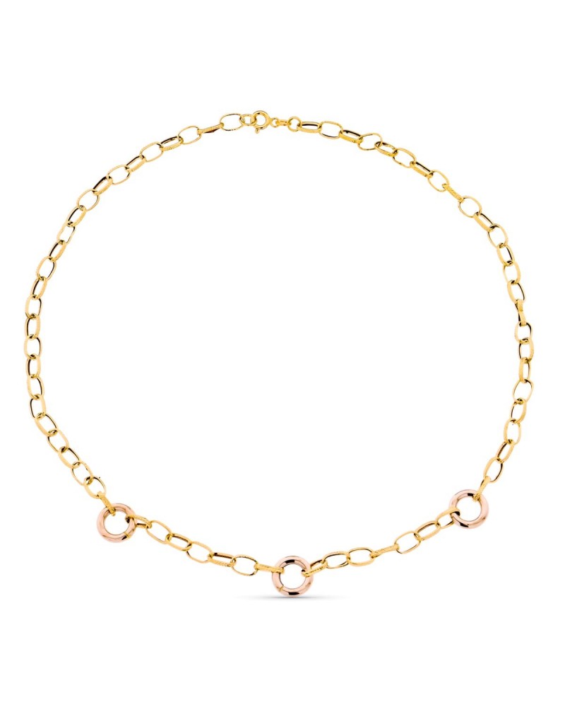 Esta elegante gargantilla presenta un diseño bicolor muy actual, con eslabones ovales en oro amarillo que se intercalan armoniosamente con aros decorativos en oro rosa. La combinación de ambos tonos de oro crea un efecto visual sofisticado y moderno, ideal para mujeres que buscan un complemento versátil y distintivo.