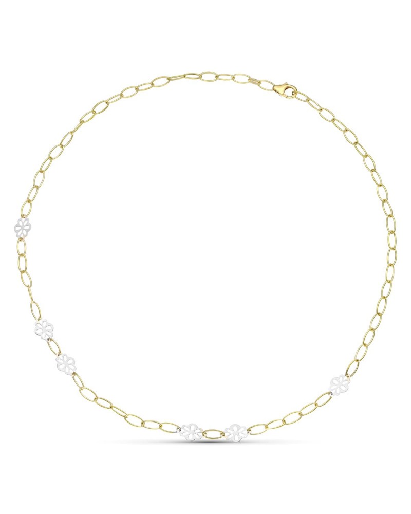 Esta elegante gargantilla presenta un diseño bicolor que combina armoniosamente eslabones ovalados en oro amarillo con delicadas flores talladas en oro blanco. Los motivos florales se distribuyen de manera equilibrada a lo largo de toda la cadena, creando un contraste visual sofisticado y atemporal que aporta luminosidad al escote.