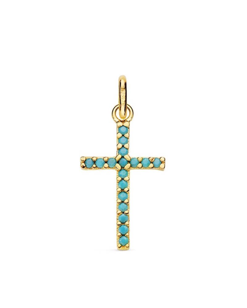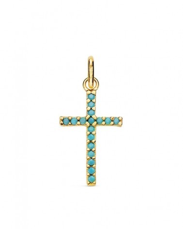 Cruz de oro amarillo de 18 quilates decorada con piedras turquesas que cubren completamente su superficie. Con unas medidas de 16x10 mm y un peso aproximado de 0,7 gramos, presenta un diseño clásico con un toque de color muy elegante.