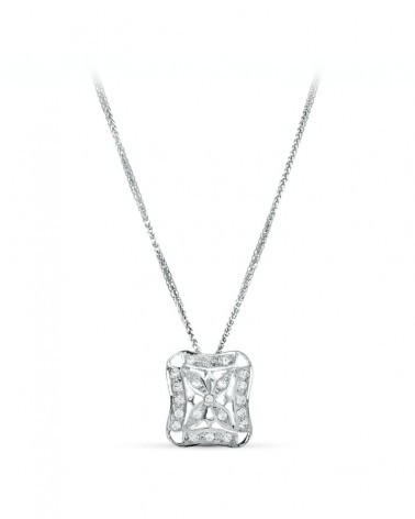 Esta gargantilla de oro blanco de 18 kilates presenta un elegante diseño con un motivo cuadrado central de 17x17 mm que captura la luz de manera excepcional. El colgante cuadrado muestra un trabajo artesanal detallado con patrones geométricos que le confieren un aspecto sofisticado y contemporáneo, perfecto para ocasiones especiales.