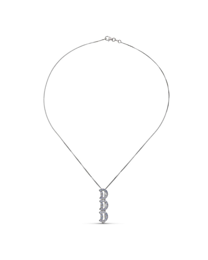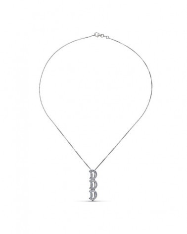 Esta sofisticada gargantilla presenta un diseño contemporáneo con tres letras dispuestas verticalmente como colgante central. Cada letra está delicadamente engarzada con circonitas que captan y reflejan la luz, creando un efecto brillante muy atractivo. La cadena de oro blanco de 18 quilates es fina y elegante, proporcionando el complemento perfecto para resaltar el colgante.