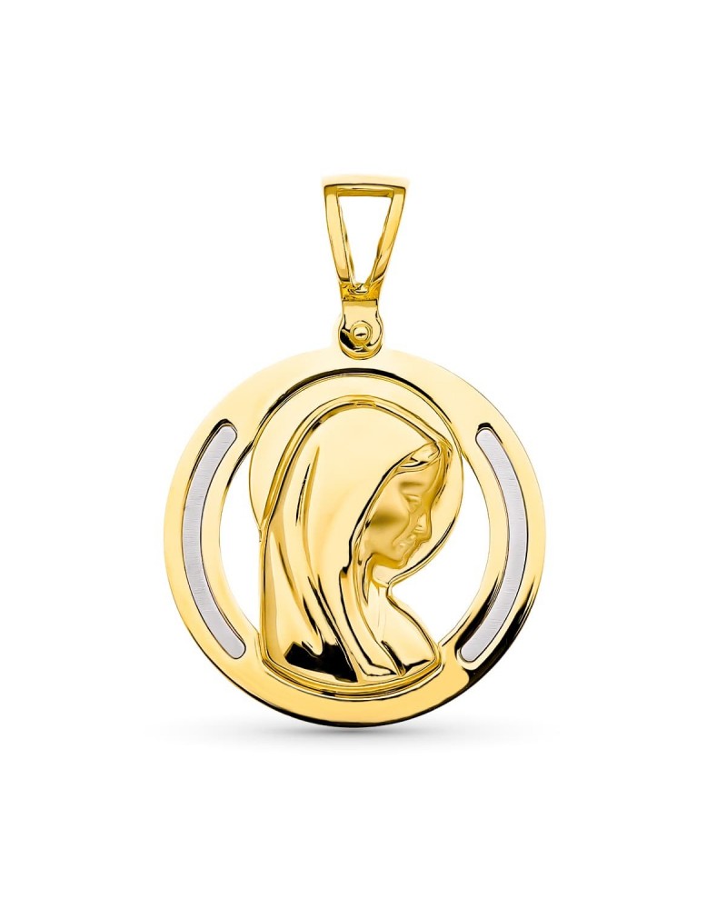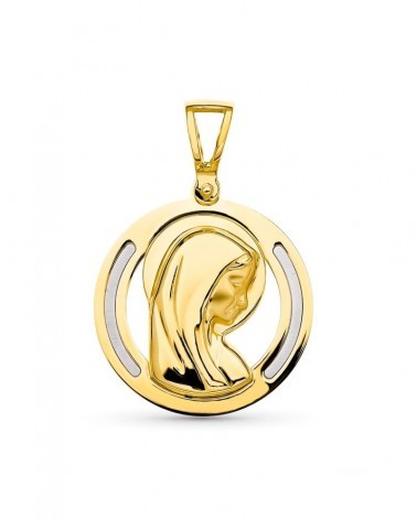 Medalla de la Virgen Niña en oro de 18 quilates bicolor con un diseño religioso elegante. La pieza presenta un diámetro de 19 mm y cuenta con un peso aproximado de 2,9 gramos. El acabado combina oro amarillo pulido con detalles en oro blanco mate, creando un contraste visual muy atractivo.
