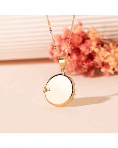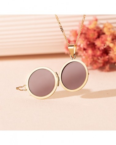 Este elegante guardapelo presenta un diseño circular perfecto con acabado liso y brillante que refleja la luz de manera excepcional. Su superficie dorada uniforme y su forma redonda clásica lo convierten en una pieza atemporal que nunca pasa de moda. El cierre lateral permite abrir y cerrar el guardapelo de forma segura.