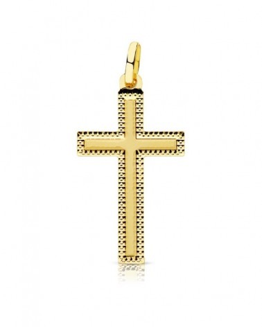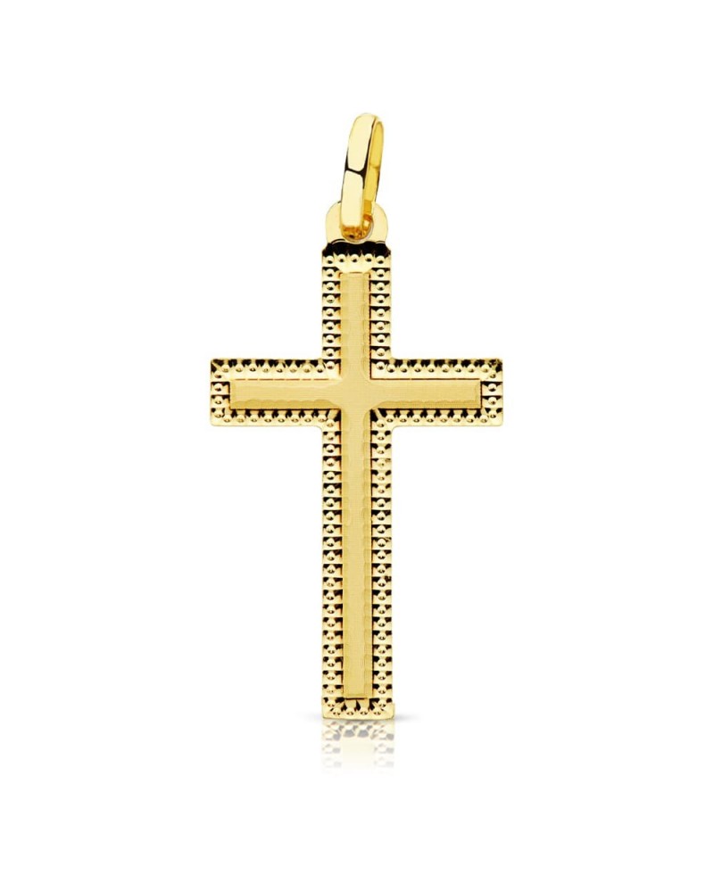 Esta cruz de oro amarillo presenta un diseño clásico y elegante con acabado tallado en todo su perímetro. El trabajo artesanal se aprecia en los detalles decorativos que bordean tanto el brazo vertical como el horizontal, creando un contraste visual sofisticado entre las superficies pulidas del centro y el tallado perimetral.