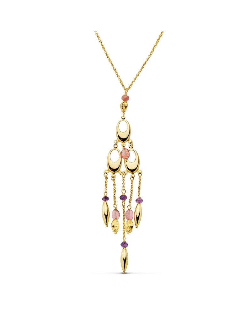 Fabricado íntegramente en oro amarillo de 18 quilates con acabado pulido brillante, este collar presenta un peso aproximado de 9,4 gramos que le confiere la consistencia perfecta. Las piedras de color rosado y violeta están cuidadosamente engastadas entre los elementos dorados, creando un contraste cromático muy atractivo. La cadena es de eslabones finos que complementa perfectamente la delicadeza del colgante.