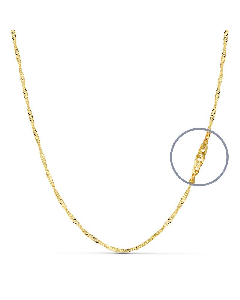 Esta elegante cadena de oro amarillo presenta el clásico diseño Singapur, caracterizado por su trama de eslabones entrelazados que crean un efecto visual muy atractivo al captar la luz. Su acabado pulido resalta el cálido brillo dorado típico del oro de 18 quilates, convirtiendo esta pieza en un complemento versátil y sofisticado.