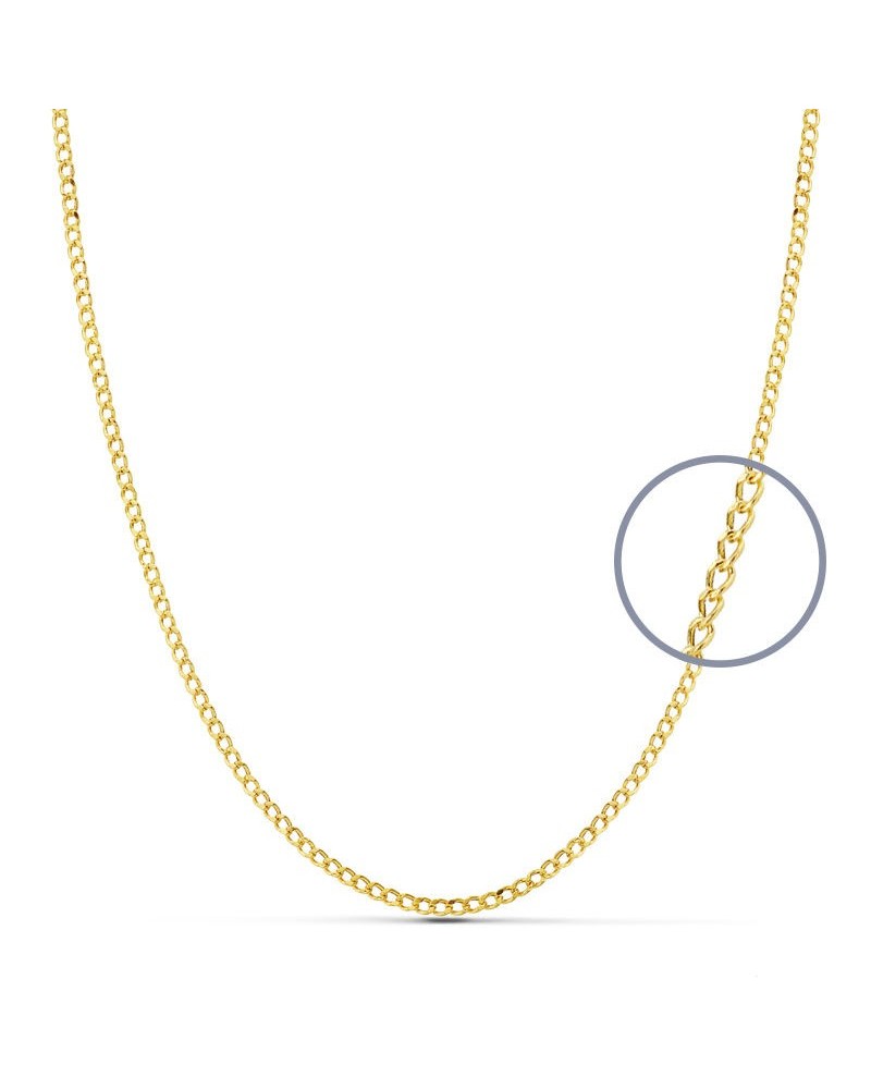 Confeccionada en oro amarillo de 18 kilates con un ancho de 1 mm y una longitud de 45 cm, esta cadena tiene un peso aproximado de 1,5 gramos. Su construcción hueca permite mantener la elegancia visual del oro macizo con mayor comodidad y un precio más accesible. Los eslabones están perfectamente soldados para garantizar resistencia y durabilidad.